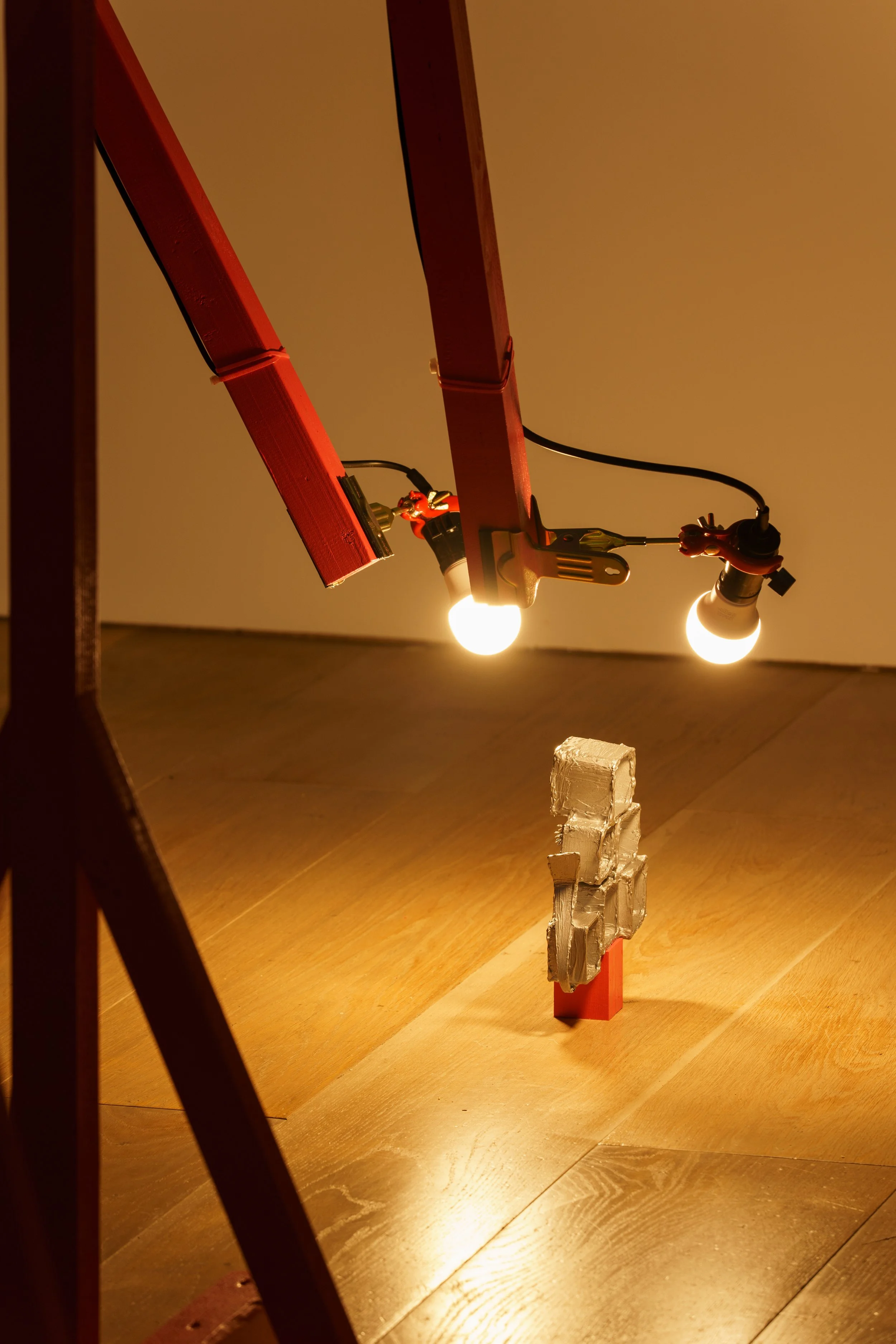 On the opposite side of the room, a red structural frame was devised by reverse-calculating from the spatial arrangement of the small monitors. Built improvisationally yet grounded in structural logic, it incorporates diagonal braces and reinforcements without concealing or exaggerating them, presenting them simply as elements that belong there by structural necessity. This coexistence of necessity and improvisation allows the structure to spatially bring together two of the work’s contrasting themes: “infrastructure” and “handwork.”