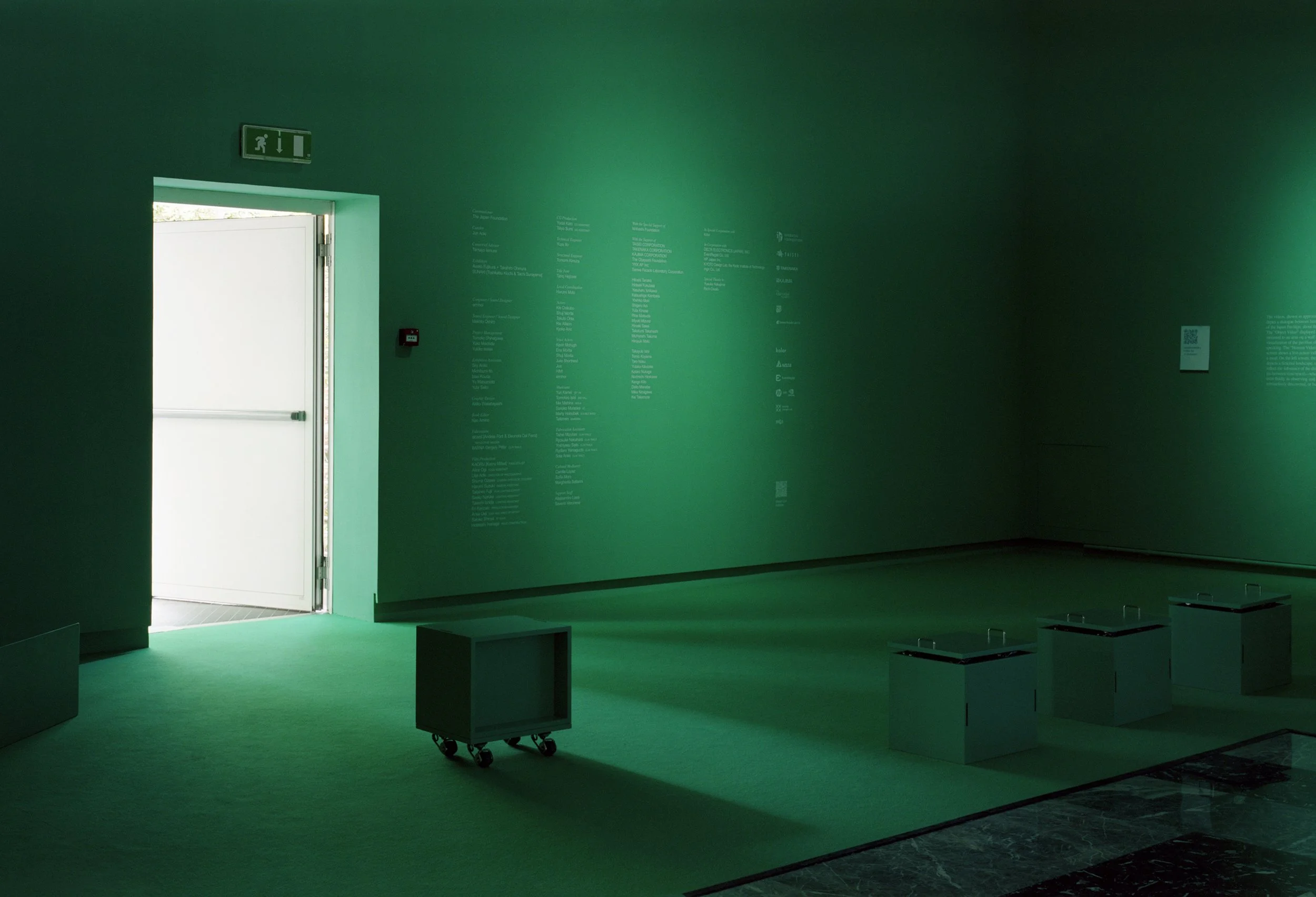 展示室を動き回り、ときに立ち止まることをサポートしつつ、同時に観るもの自身の身体をつねに意識下にとどめておくための装置として、専用のスツールも設計・制作された。このスツールはボックスユニットとホイールユニットに分かれ、鑑賞者はそれを自由に組み合わせながら、展示室内を滑るように移動し、任意の位置で映像を視聴することができる。また、脚部に取り付けられたキャスター(金具部そのものがバネになった特殊なスプリング・キャスター)は、座った際にわずかなクッション性と揺らぎを生み出す。この微細な揺れが「私はここにいる」という実感をもたらし、虚構(映像)と現実(日本館)のフィードバック・ループを立ち上げる起点となる。